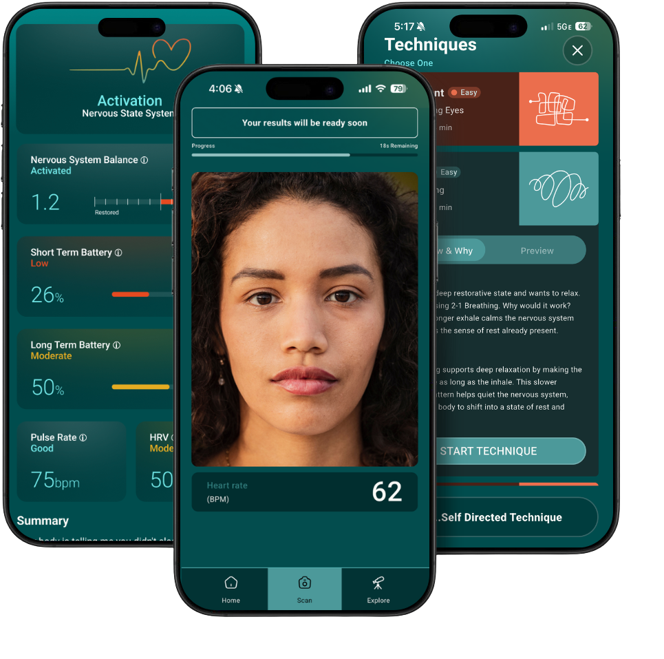 IMIN scans your nervous system using rPPG biometrics through your phone's camera, classifies your autonomic state from 20 possible configurations, and recommends the technique most likely to work for your current state and goal. After the session, a second scan measures what actually happened. Every session makes the next recommendation smarter.